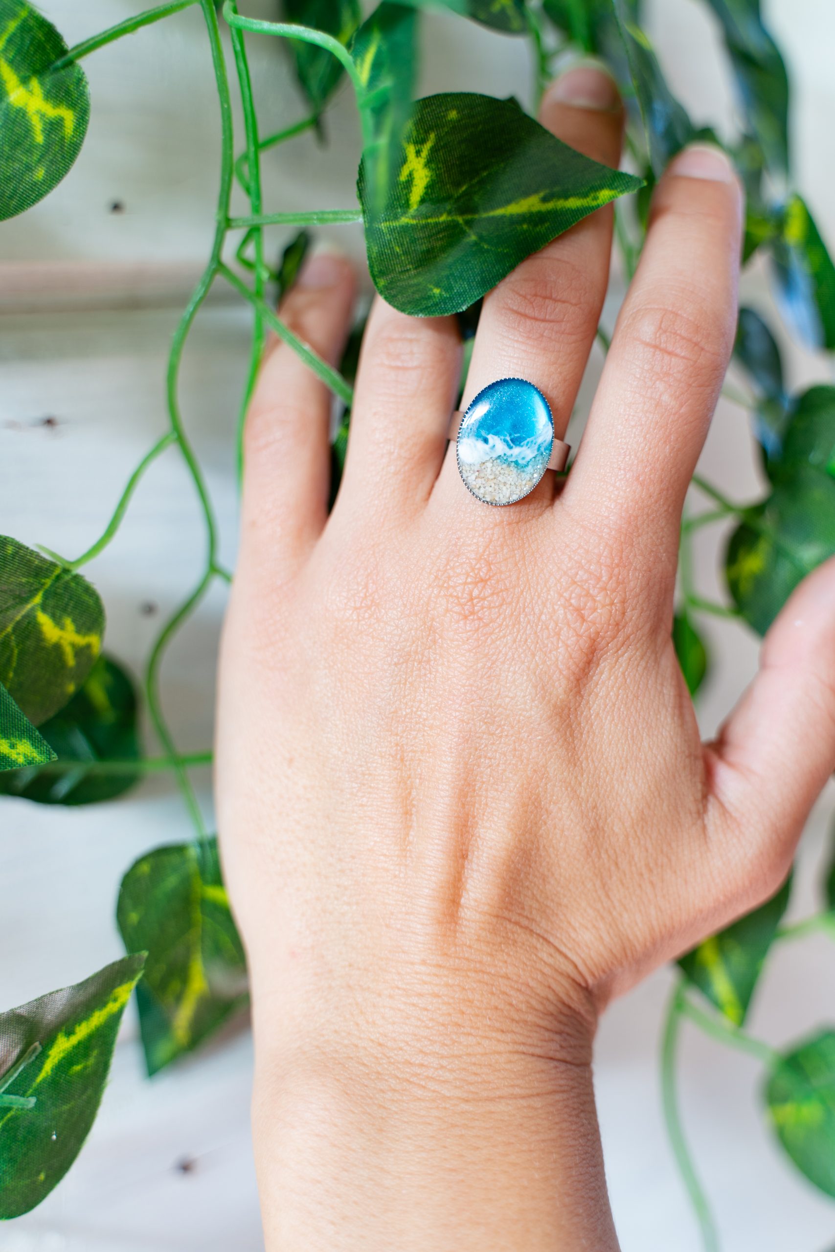 Joya en acero inoxidable, decorada a mano con resina epoxi y arena. El oval mide 18×25 mm. Medida ajustable. Cada pieza viene creada y decorada a mano, así que la imagen es puramente demostrativa. El producto final puede diferenciarse ligeramente de tono de color y de dibujo de la ola.