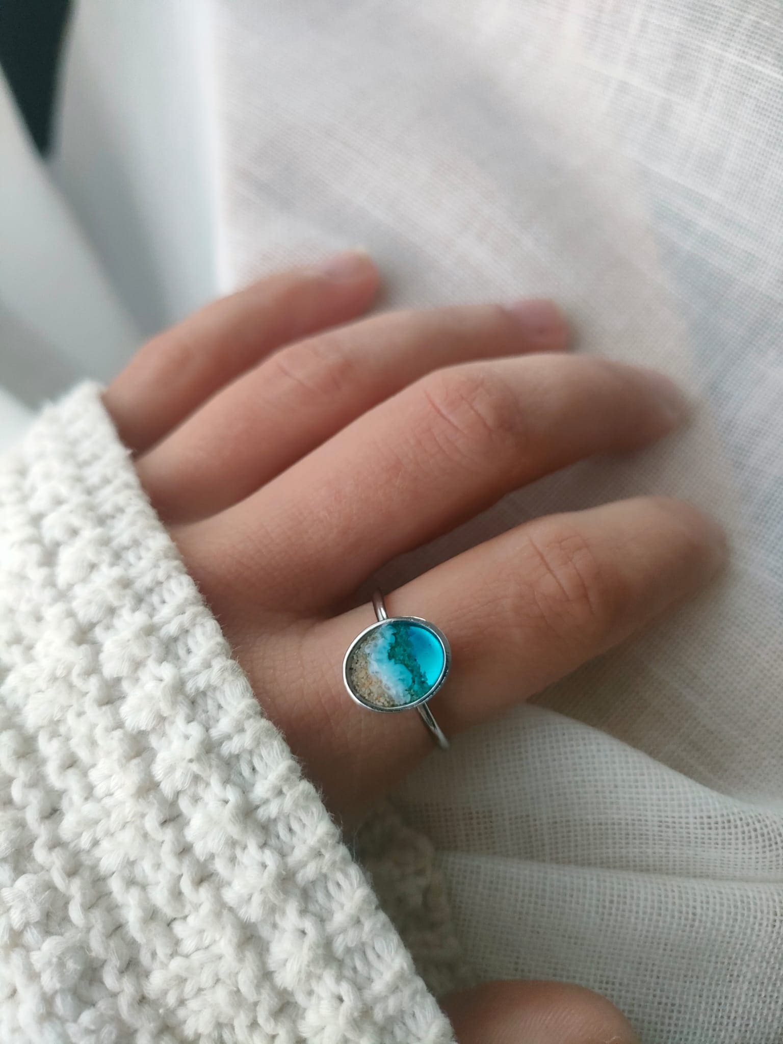 Joya en acero inoxidable, decorada a mano con resina epoxi y arena. El oval mide 11×9 mm. Medida ajustable. Cada pieza viene creada y decorada a mano, así que la imagen es puramente demostrativa. El producto final puede diferenciarse ligeramente de tono de color y de dibujo de la ola.
