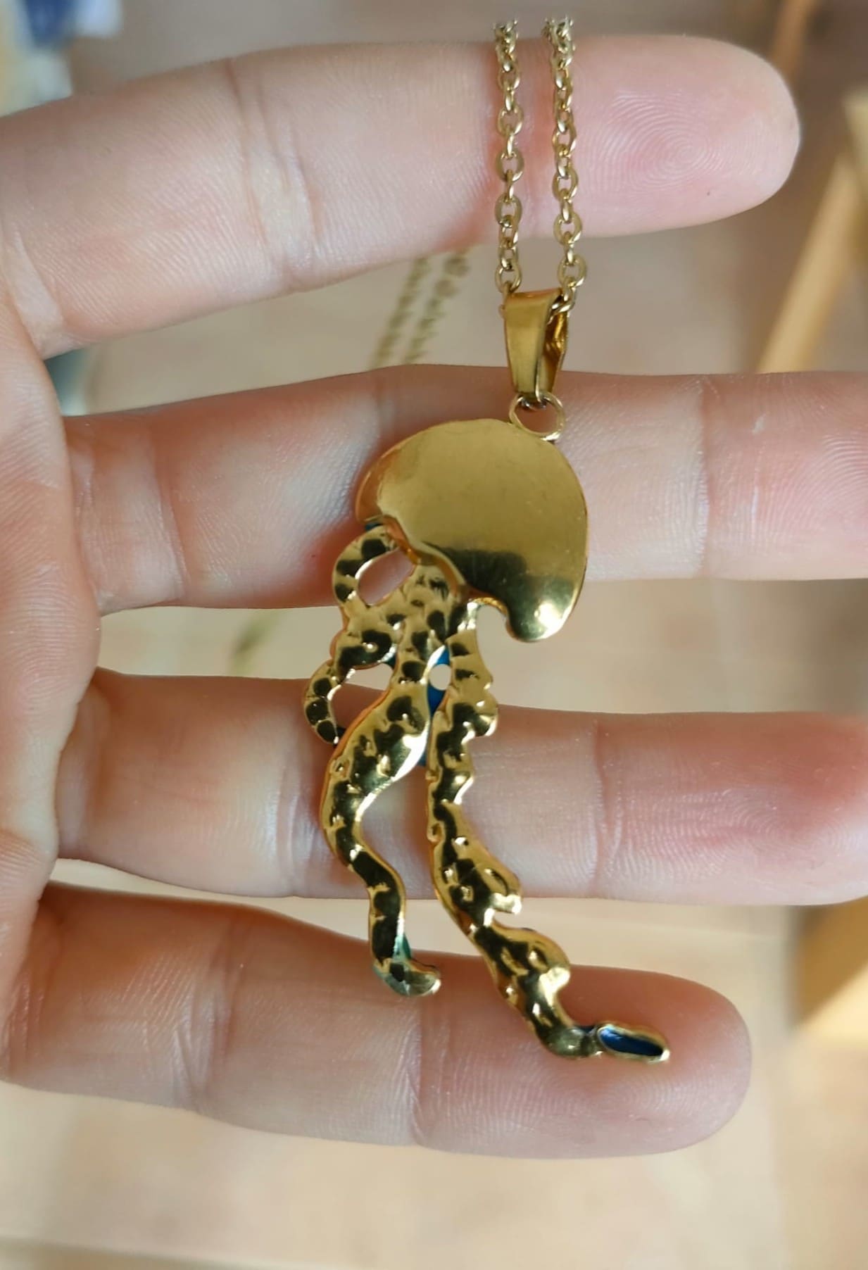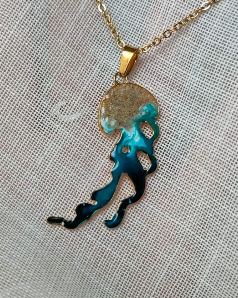 Joya en acero inoxidable, decorada a mano con resina epoxi y arena. Cadena de acero inoxidable 316L hipoalergénico. Cada pieza esta creada y decorada a mano, así que la imagen es puramente demostrativa. El producto final puede diferenciarse ligeramente de tono de color y de dibujo de la ola.