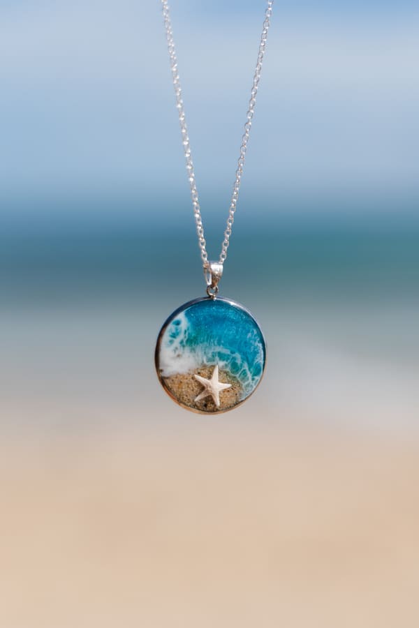 Joya en acero inoxidable, decorada a mano con resina epoxi y arena. Cadena en plata 925. Cada pieza es única y decorada a mano, la imagen es demostrativa. El producto final puede diferenciar ligeramente de tono de color y dibujo de la ola