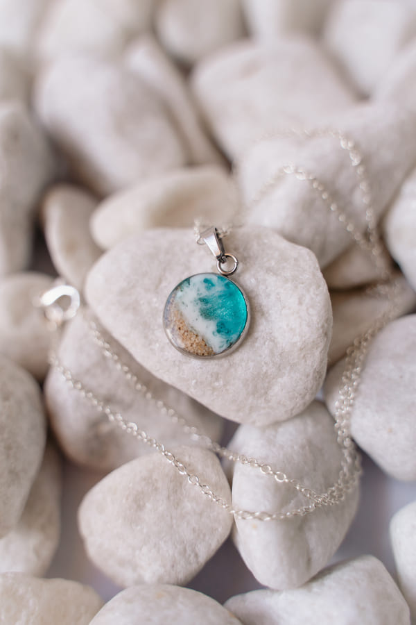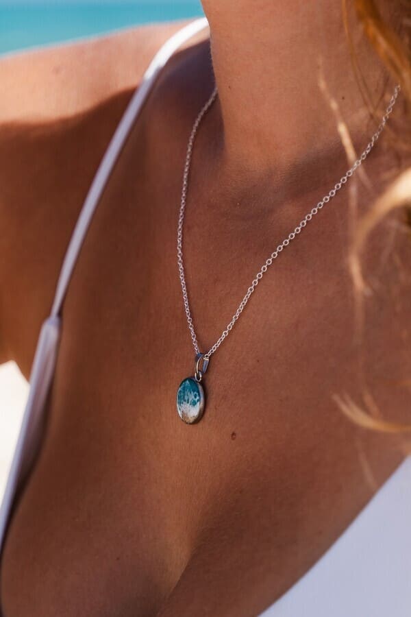 Joya en acero inoxidable, decorada a mano con resina epoxi y arena. Cada pieza es única y decorada a mano, la imagen es demostrativa. El producto final puede diferenciar ligeramente de tono de color y dibujo de la ola. Cadena en plata 925.