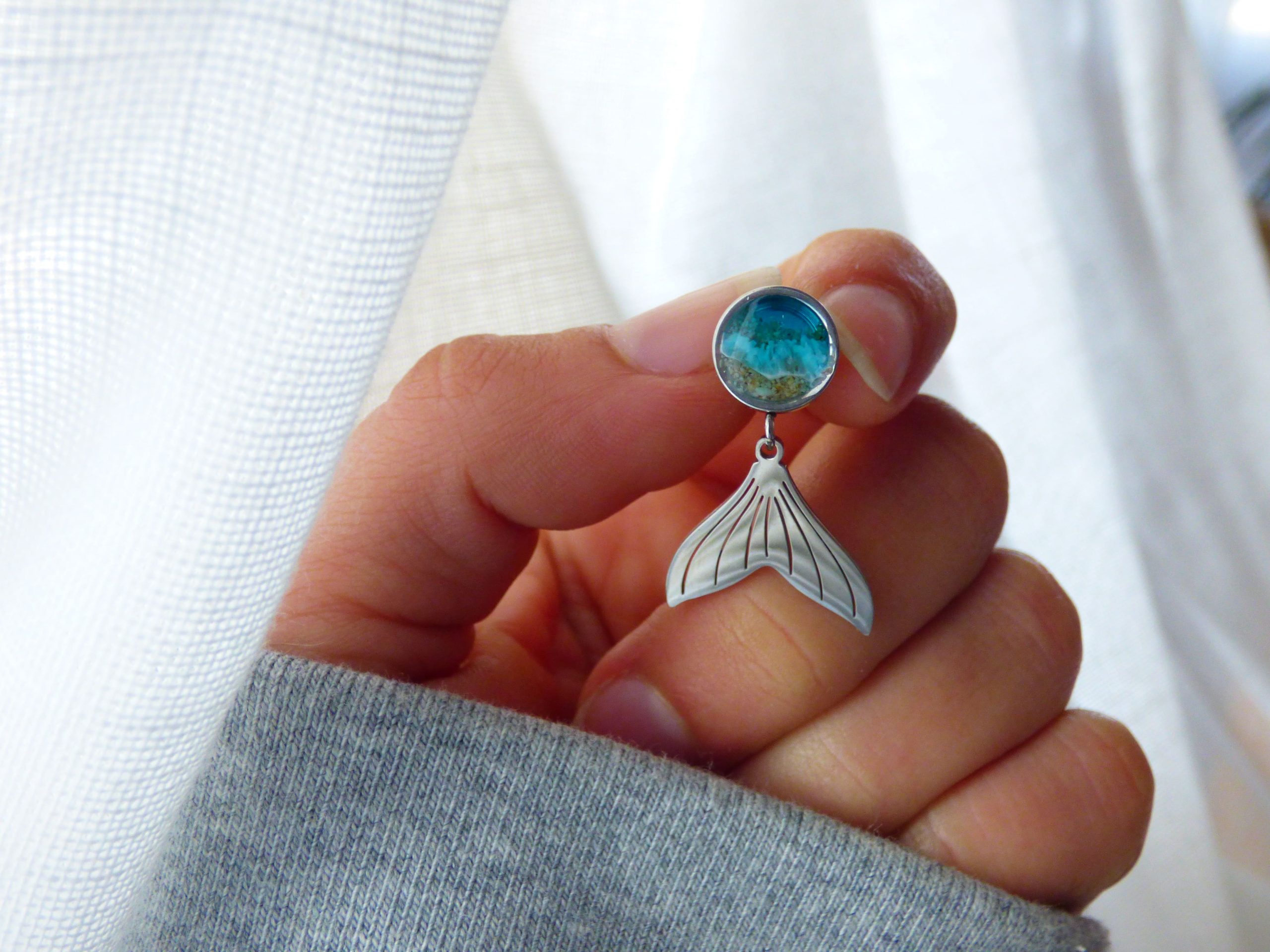 Pendientes en acero inoxidable, decorados a mano con resina epoxi y arena. Ganchos de acero inoxidable 316L hipoalergénico . Cada pieza es única y decorada a mano, la imagen es demostrativa. El producto final puede diferenciar ligeramente de tono de color y dibujo de la ola