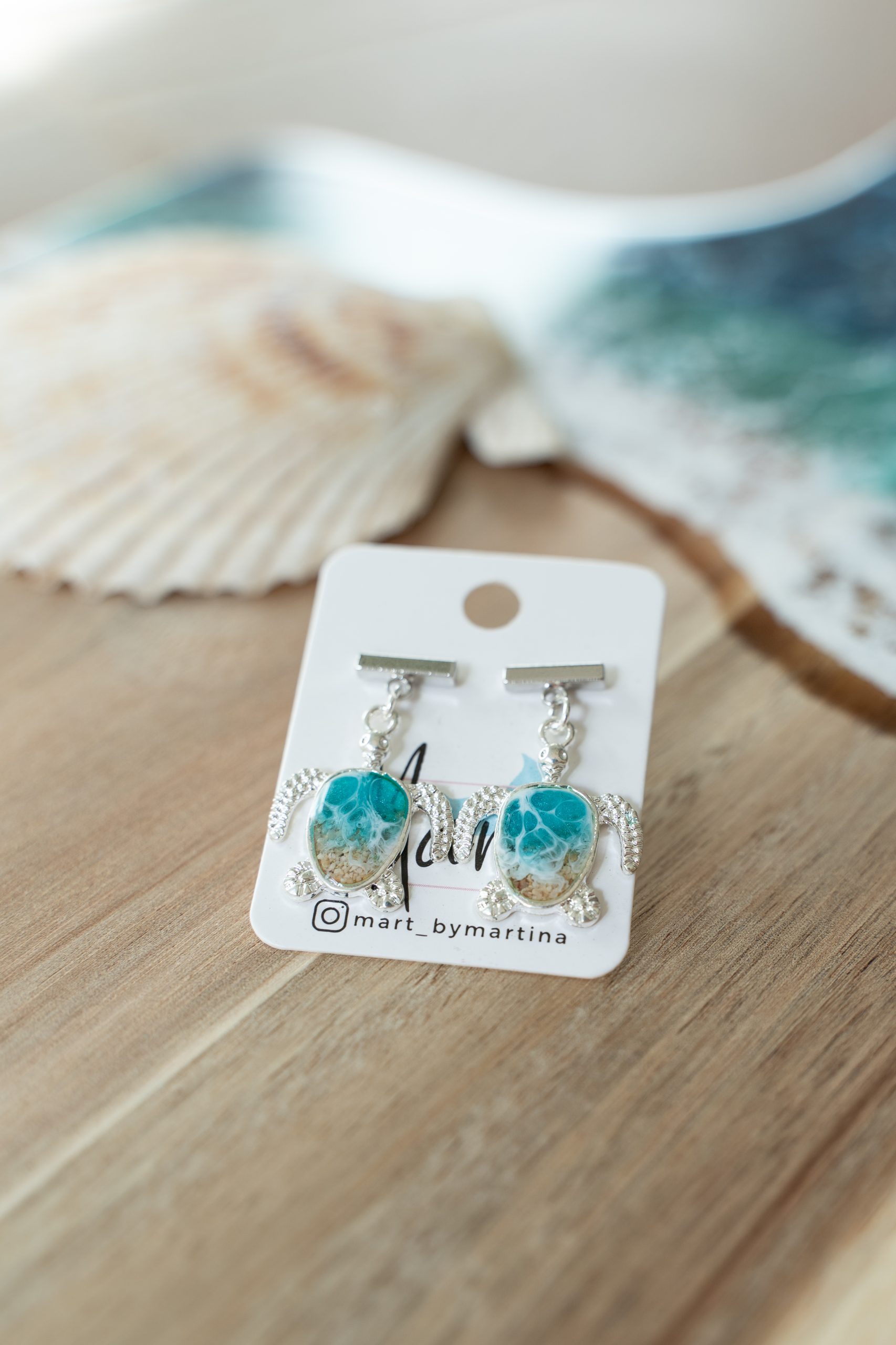 Pendientes en acero inoxidable, decorados a mano con resina epoxi y arena. Ganchos de acero inoxidable 316L hipoalergénico.  Cada pieza viene creada y decorada a mano, así que la imagen es puramente demostrativa. El producto final puede diferenciarse ligeramente de tono de color y de dibujo de la ola.