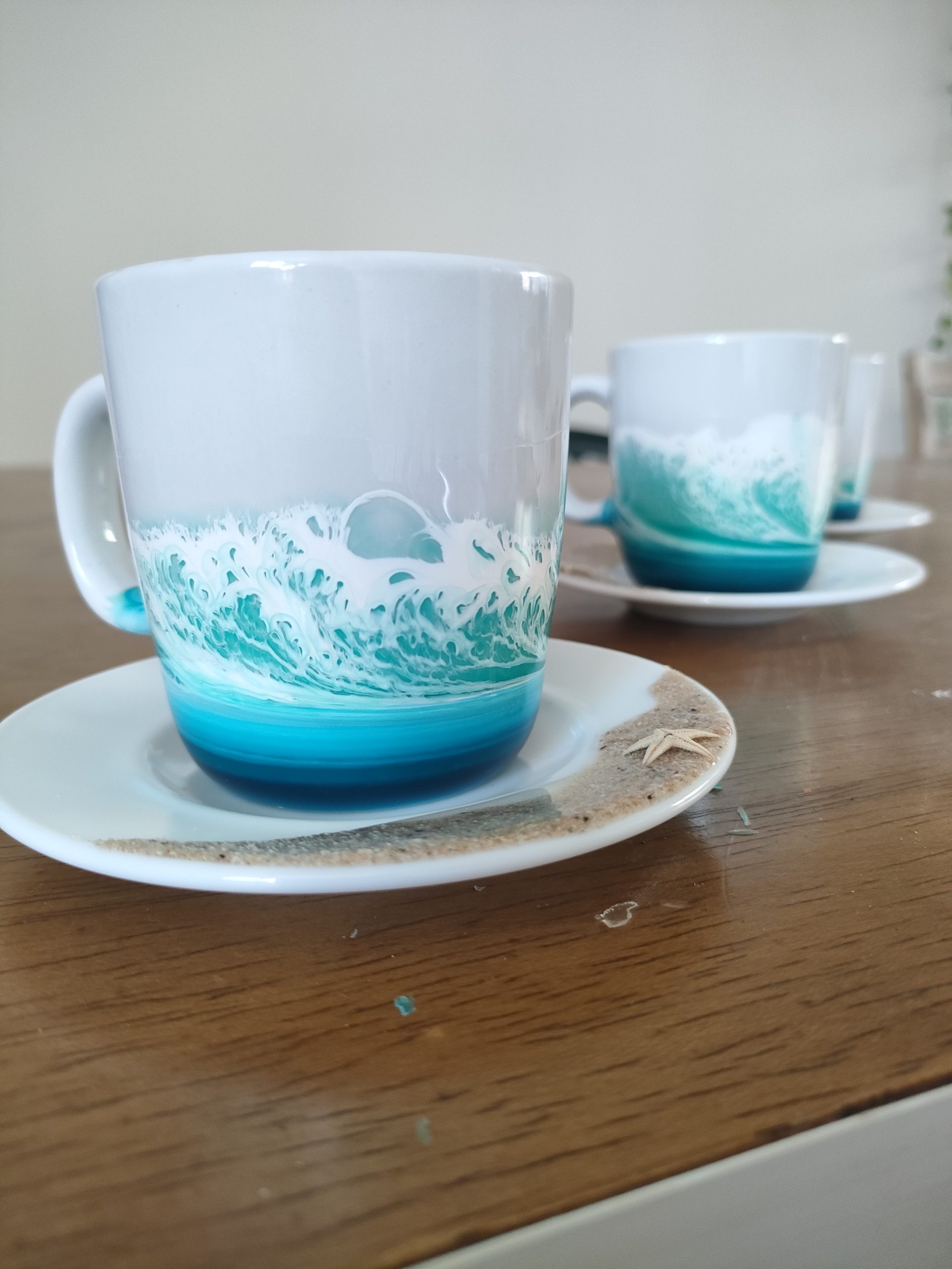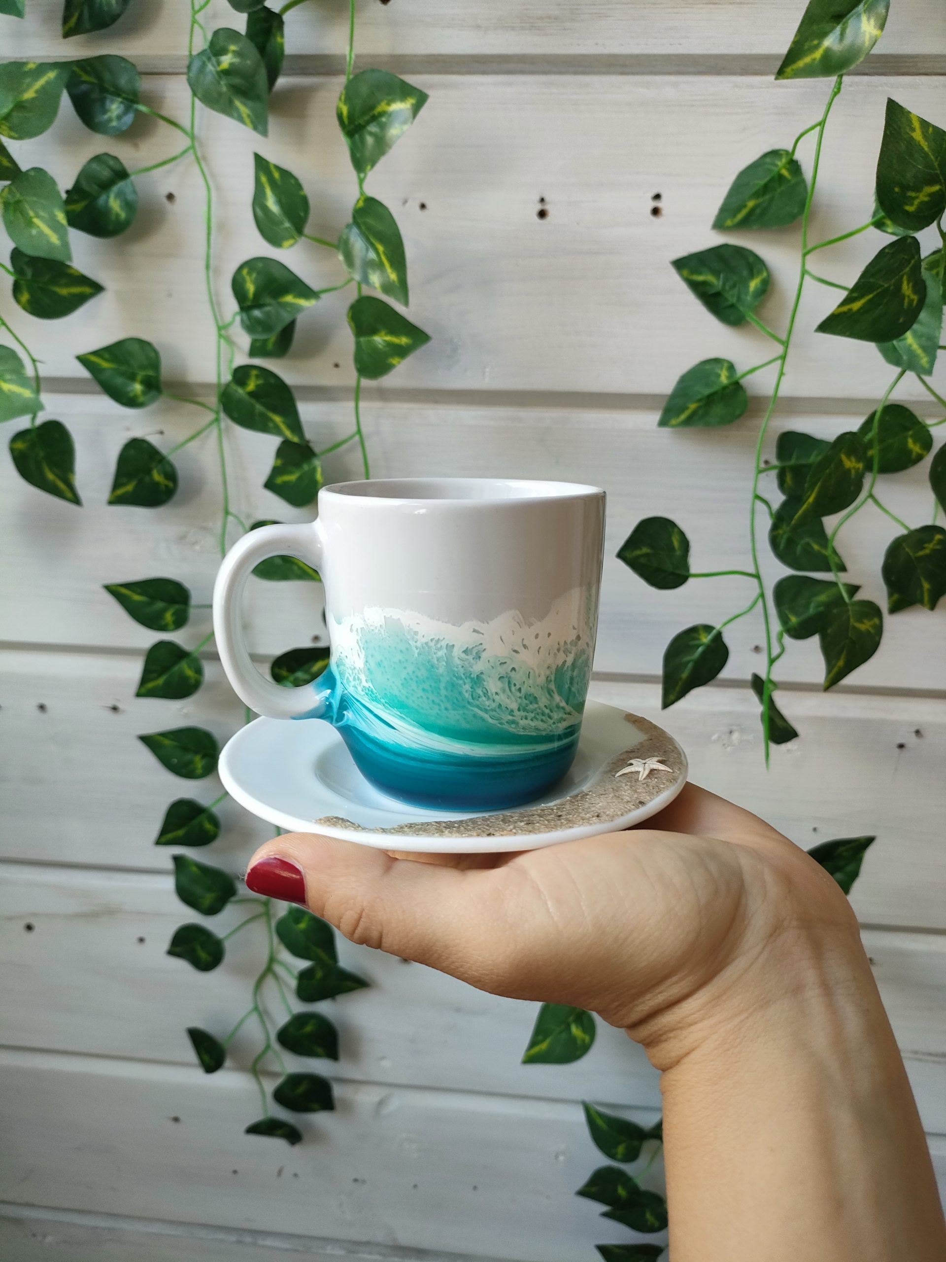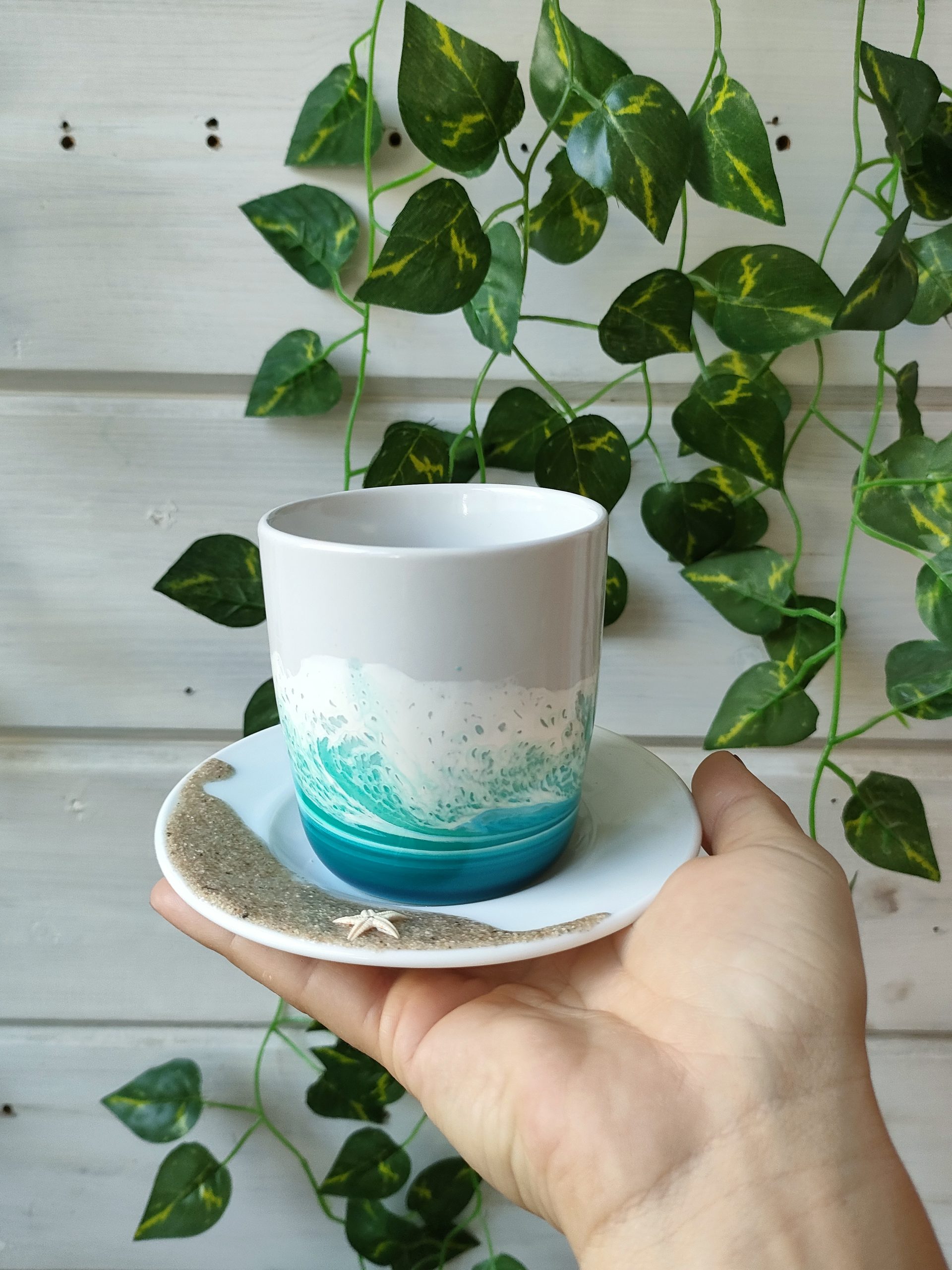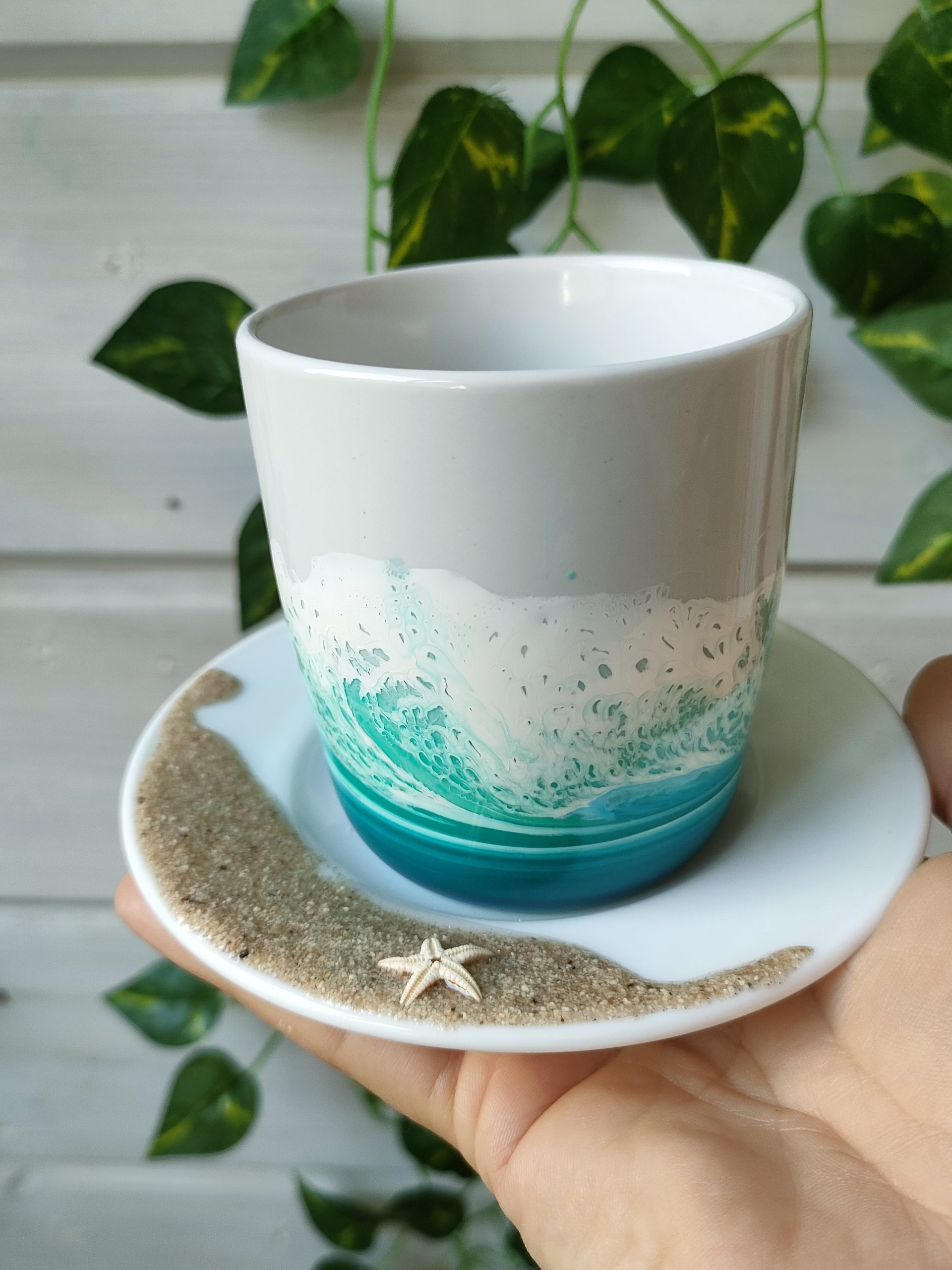 Taza y platito en cerámica blanca, decorados con resina epoxy, arena natural y estrella de mar. Cada pieza es única y está decorada a mano, la imagen es demostrativa. El producto final puede diferenciar ligeramente de tono de color y dibujo de la ola.